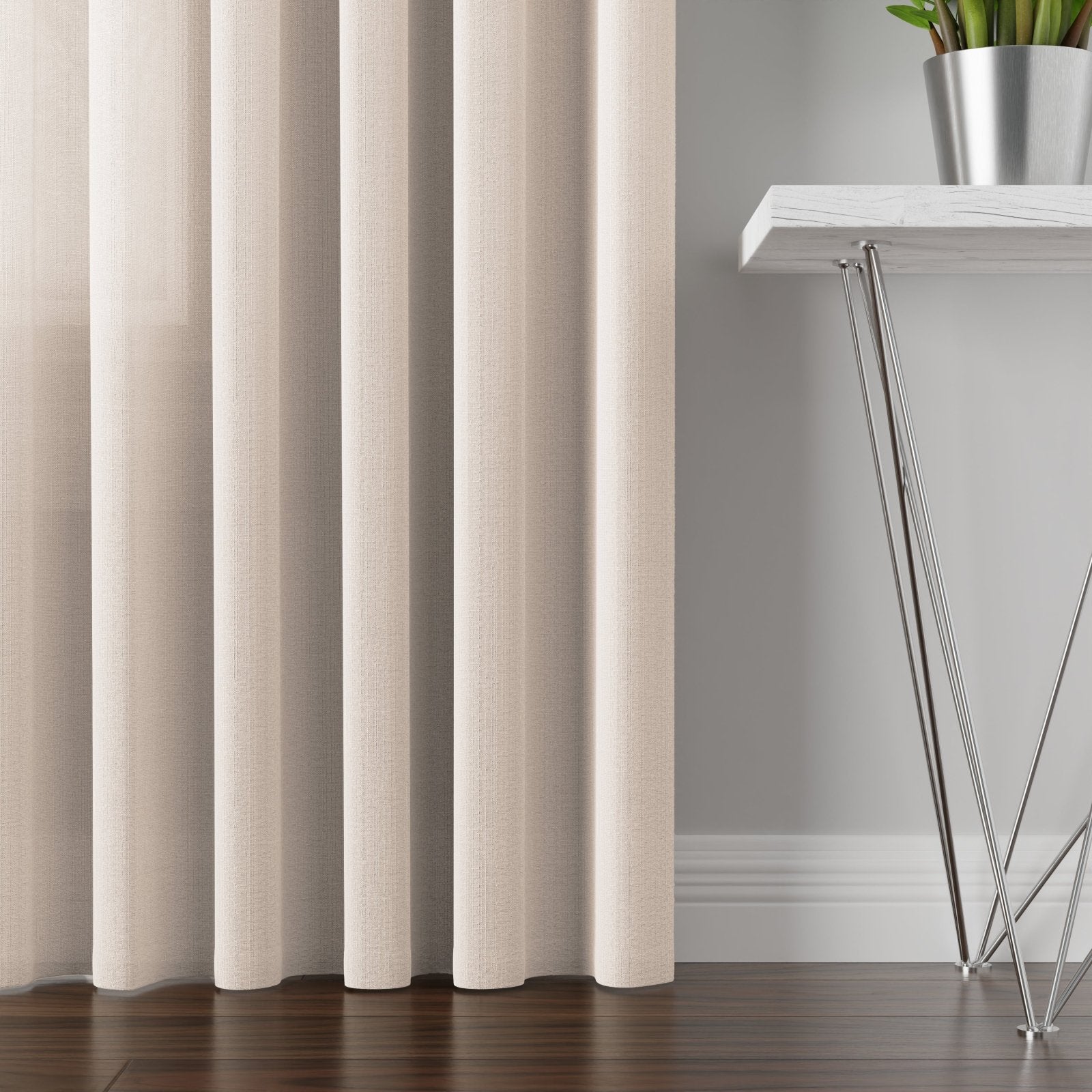 Der Vorhang verfügt über eine eingenähte Wellenschiene, die das Aufhängen direkt an der Gardinenstange ohne Ringe oder Haken ermöglicht. Zusammen mit dem dezenten Bleiband am unteren Ende sorgt dies für einen ruhigen, gleichmäßigen Fall und klare, gleichmäßige Wellen bis ganz nach unten.
